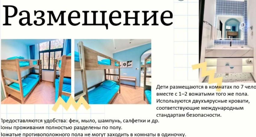 Дети размещаются в комнатах по 7 человек вместе с 1–2 вожатыми того же пола.